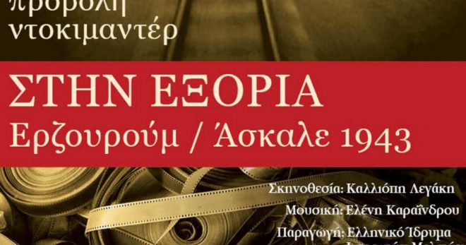 Το Ίδρυμα Ιστορικών Μελετών (ΙΔΙΣΜΕ) σε συνεργασία με τους Μικρασιατικούς Συλλόγους Φιλοθέης – Ψυχικού, Μελισσίων και Πεύκης θα πραγματοποιήσει την προβολή του ιστορικού ντοκιμαντέρ «Στην Εξορία του Ερζουρούμ – Άσκαλε  1943», στο Δημοτικό Θέατρο Πεύκης (Χρυσοστόμου Σμύρνης & Ρήγα Φεραίου), στις 4 Μαρτίου, στις 7 το απόγευμα.  Μετά την προβολή οι τρεις σύλλογοι έχουν διοργανώσει για τους παρευρισκόμενους μια μουσική βραδιά με τραγούδια και χορό από τις χαμένες πατρίδες.