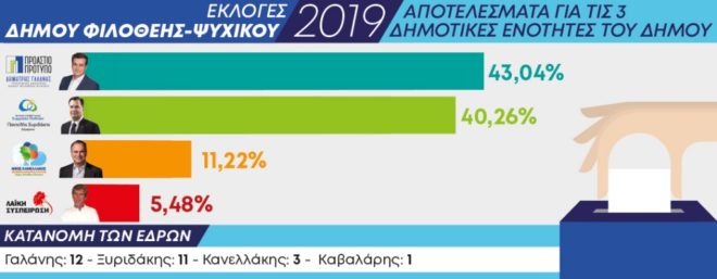«Προάστιο Πρότυπο» και Δημήτρης Γαλάνης. Παίρνουν το 2019: 53,37% και 2290 ψηφοδέλτια. Η Φιλοθέη ανοίγει διάπλατα την πόρτα της στον Δημήτρη Γαλάνη. Η ευθύνη για την επόμενη ημέρα της δεύτερης εκλογικής διαδικασίας είναι μεγάλη, τόση όσα και τα προβλήματα της όμορφης κηπούπολης που πρέπει να επιλυθούν. Συγκριτικά αποτελέσματα με το 2014 δεν έχουμε. Ο κυριότερος διεκδικητής, όμως, αφήνει πίσω τον απερχόμενο κατά 16,71% ποσοστιαίες μονάδες που μεταφράζονται σε 717 ψήφους!