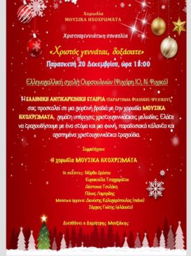 Το Παράρτημα της Ελληνικής Αντικαρκινικής Εταιρίας του Δήμου Φιλοθέης Ψυχικού, διοργανώνει και σας προσκαλεί την Παρασκευή 20 Δεκεμβρίου και ώρα 18:30, στην ετήσια συναυλία του, που θα πραγματοποιηθεί στην αίθουσα της Σχολής Ουρσουλινών (Ψυχάρη 10 στο Νέο Ψυχικό) και θα έχει θέμα: «Χριστουγεννιάτικα τραγούδια».