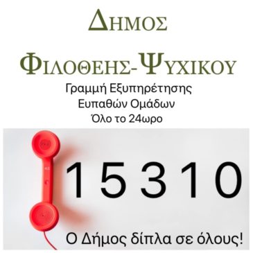 Ο Δήμος Φιλοθέης Ψυχικού και τηλεφωνικά πλέον δίπλα στους δημότες που έχουν ανάγκη. Ο πενταψήφιος αριθμός ξεκίνησε να λειτουργεί πριν από μια ώρα περίπου και βρίσκεται στη διάθεση των ευπαθών ομάδων πληθυσμού, αλλά και σε όσους έχουν ανάγκη εξυπηρέτησης.