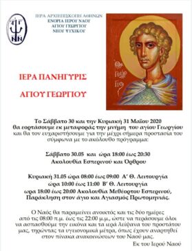 Όπως ενημερωθήκαμε από τον Ιερό Ναό Αγίου Γεωργίου Νέου Ψυχικού, το Σάββατο 30 και την Κυριακή 31 Μαΐου θα εορταστεί εκ μεταφοράς η μνήμη του Αγίου Γεωργίου σύμφωνα με το ακόλουθο πρόγραμμα: