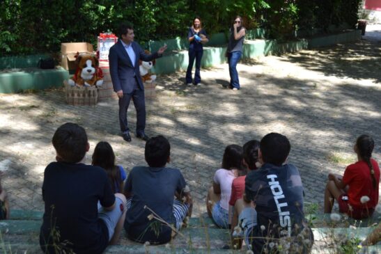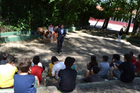 Την Τετάρτη 10 Ιουνίου στον αύλειο χώρο του Δημοτικού της Φιλοθέης στήθηκε το σκηνικό. Στο κέντρο το σιδερένιο κουτί για να το αναγνωρίζουν γύρω από αυτό σκουποφαρασάκια, τρία μεγάλα λούτρινα σκυλάκια, ένα καλάθι με λιχουδιές για τους τετράποδους φίλους τους και ένα άλλο με καραμέλες για αυτά. Ίσως να είναι και η πρώτη φορά που για μισή ώρα είδαμε παιδιά τέτοιας ηλικίας να ακούν με αμείωτο ενδιαφέρον το Δήμαρχο Δημήτρη Γαλάνη να τους εξηγεί. Άμεσος, ξεκίνησε να μιλάει λέγοντάς τους ότι γνωρίστηκαν καλύτερα την εποχή της καραντίνας όπου τα παιδιά τρέχανε με τα ποδήλατα και τις μπάλες και αυτός… τους κυνηγούσε! Στην συνέχεια απευθύνθηκε στους τελειόφοιτους της έκτης δημοτικού και τους θύμισε την συνάντηση που είχε μαζί τους τον περασμένο Δεκέμβρη. «Μου ζητήσατε καθαρά πεζοδρόμια. Μου είπατε ότι δεν μπορείτε να περπατήσετε από τα περιττώματα των σκύλων. Τώρα σας παρουσιάζω την λύση και σας ζητώ να με βοηθήσετε να την μεταδώσετε σε όσους βλέπετε στον δρόμο με σκυλιά. Κάναμε μια συμφωνία. Την τήρησα και σας θέλω δίπλα μου. Με αυτήν την κίνηση βοηθάμε την καθαριότητα, το περιβάλλον αλλά και την οικονομία της χώρας μας. Πρόκειται για ελληνική πατέντα». Και εκεί σταμάτησε για να απαντήσει στις καταιγιστικές ερωτήσεις των παιδιών: