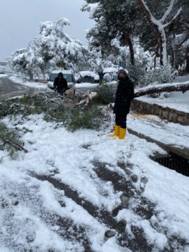 Ο Αντιδήμαρχος Καθαριότητας και υπεύθυνος Πολιτικής Προστασίας Γιώργος Παπαχρόνης που μαζί με τους εργαζόμενους σήκωσαν το βάρος επίλυσης των προβλημάτων μας δηλώνει: «Από την Κυριακή το βράδυ στις 11:30 είμαστε στους δρόμους, και κάπως έτσι ειδοποιήσαμε και την Περιφέρεια για την κατάσταση στην Κηφισίας και στις 12:40 ήρθαν οι πρώτες αλατιέρες και τα πρώτα εκχιονιστικά στη λεωφόρο. Έκτοτε και μέχρι το τέλος του χιονιά ήμουνα στο δρόμο. Θα επικεντρωθώ, όμως, στους ανθρώπους μας στην Καθαριότητα, στο Πράσινο και στην Πολιτική Προστασία -που ανταποκρίθηκαν φιλότιμα κι έδωσαν το παρών καθ’ όλη τη διάρκεια της κακοκαιρίας. Η χιονόπτωση ξεκίνησε Δευτέρα, από την επομένη το πρωί όλοι ήταν στους δρόμους. Όλος ο κόσμος από την Καθαριότητα το Πράσινο και την Πολιτική Προστασία, όλοι. Είχαμε προμηθευτεί, ως Δήμος, οκτώ τόνους αλάτι και το ίδιο απόγευμα το ρίξαμε στα ψηλά σημεία του Ψυχικού και της Φιλοθέης. Η χιονόπτωση βέβαια συνεχιζόταν, οπότε συνεχίσαμε να ρίχνουμε αλάτι και την Τρίτη το βράδυ. Για να αντιμετωπίσουμε την κατάσταση νοικιάσαμε τρία εκχιονιστικά JCB και δύο bobcat. Ταυτόχρονα συνεργαστήκαμε με τρεις εργολάβους όπου το προσωπικό τους με το προσωπικό της Υπηρεσίας Πρασίνου βγήκε στους δρόμους, έκοβε κλαδιά και τα απομάκρυνε. Επρόκειτο για πλήρη κινητοποίηση σε 24ωρες βάρδιες. Εμείς συντονίζαμε και το προσωπικό δούλευε. Εμείς δεν ανεβήκαμε στα δέντρα, ούτε μπήκαμε στο χιόνι μέχρι τη μέση. Κι όμως δεν δίστασαν καθόλου κι ανταποκρίθηκαν άμεσα. Κάποιοι διέκοψαν, από μόνοι τους, τις άδειές τους. Χαρακτηριστικά να σας αναφέρω ότι την Τρίτη το βράδυ ο επόπτης Καθαριότητας της Φιλοθέης και ο επόπτης Πρασίνου ¨κοιμήθηκαν¨ στο εργοτάξιο της Φιλοθέης. Σε όλους αυτούς απευθύνω ένα μεγάλο ευχαριστώ».