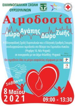 Η Ελληνογαλλική Σχολή Ουρσουλινών και ο Ελληνικός Ερυθρός Σταυρός διοργανώνουν εθελοντική αιμοδοσία, το Σάββατο 8 Μαΐου 2021 και ώρες 09:00 με 13:30, στο θέατρο του Γυμνασίου-Λυκείου της Σχολής (Ψυχάρη 10, Νέο Ψυχικό, τηλ. 2106712228), σε συνεργασία με τον Δήμο Φιλοθέης-Ψυχικού.