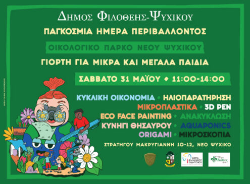 Όπως κάθε χρόνο, το Οικολογικό Πάρκο Νέου Ψυχικού (Στρατηγού Μακρυγιάννη, πίσω από το Πεντάγωνο) ανοίγει τις πόρτες του για να φιλοξενήσει τη μεγάλη γιορτή για την Παγκόσμια Ημέρα Περιβάλλοντος. Το Οικολογικό Πάρκο, ένας πρότυπος χώρος πράσινου και περιβαλλοντικής εκπαίδευσης, μετατρέπεται για ακόμη μια χρονιά σε μια ζωντανή γιορτή περιβαλλοντικής συνείδησης, δίνοντας το παράδειγμα για έναν πιο βιώσιμο τρόπο ζωής.