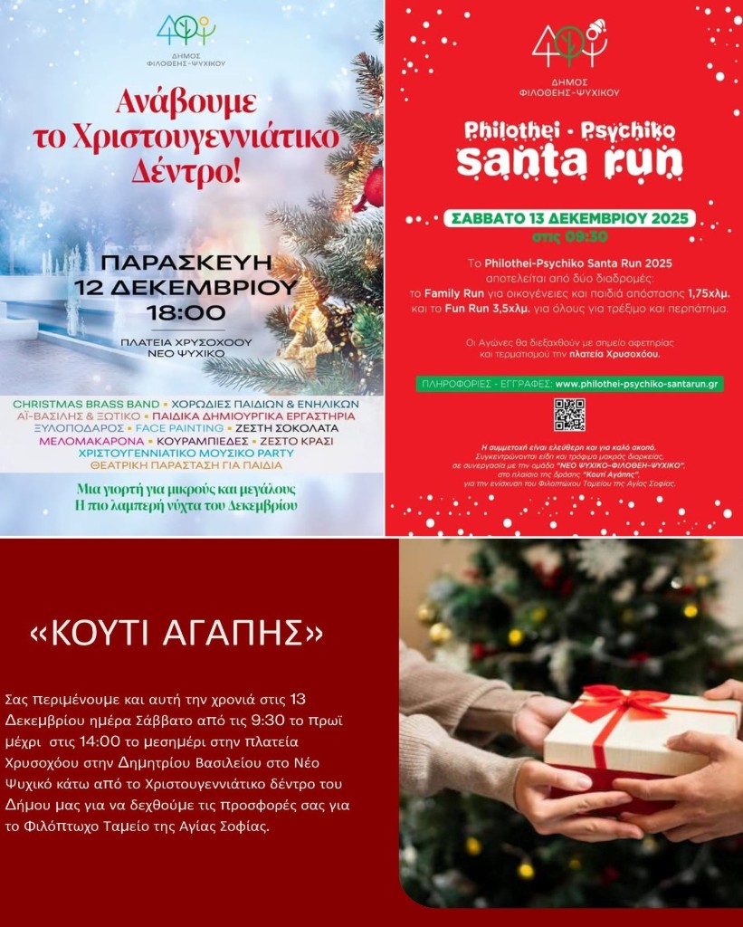 Ο Δήμος μας ντύνεται γιορτινά και ετοιμάζεται για ένα λαμπερό διήμερο, όπου η χαρά των Χριστουγέννων συναντά την προσφορά και την ανθρώπινη ζεστασιά Παρασκευή 12 Δεκεμβρίου Ανάβουμε το Χριστουγεννιάτικο Δέντρο στη φωτεινή Πλατεία Χρυσοχόου! Η καρδιά του Νέου Ψυχικού θα χτυπήσει δυνατά την Παρασκευή 12 Δεκεμβρίου στις 18:00. Η πλατεία Χρυσοχόου μεταμορφώνεται σε έναν μικρό χριστουγεννιάτικο παράδεισο, γεμάτο χρώματα, μουσικές, παιδικές φωνές και χαμόγελα. Η γιορτή ξεκινά με την Christmas Brass Band και τις γιορτινές μελωδίες της, ενώ ακολουθούν οι παιδικές χορωδίες του Δημοτικού Ωδείου και του ΜΕΟ, η χορωδία…