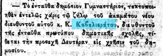 «Το ενταύθα δημόσιον Γυμναστήριο, τακτοποιηθέν εντελώς χάρις τω ζήλω, του ακαμάτου νέου διευθυντού αυτού κ. Κ. Καβαλιεράτου, διευθυντού της ενταύθα πρωτύπου δημοτικής σχολής, τίθεται την προσεχή Δευτέρα εις χρήσιν του δημοσίου».