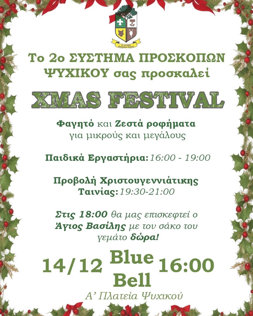 Σάββατο 14 Δεκεμβρίου – Xmas Festival Ήρθε η ώρα για το Xmas Festival!!! Στην Α’ Πλατεία Ψυχικού (Blue Bell) και ώρα 16:00 μικροί και μεγάλοι θα γιορτάσουμε μαζί τα Χριστούγεννα. Το 2ο Σύστημα Προσκόπων Ψυχικού προσκαλεί όλα τα μέλη του, αλλά και όσα παιδιά δεν είναι μέλη, στο χριστουγεννιάτικο παζάρι του. Εκεί θα απολαύσετε ζεστά ροφήματα και νόστιμα εδέσματα, ενώ παιδιά δημοτικού και γυμνασίου μπορούν να συμμετάσχουν: από τις 16:00 έως τις 19:00 σε δημιουργικά παιδικά εργαστήρια και από τις 19:30 έως τις 21:00, στην προβολή της ζεστής, χριστουγεννιάτικης παιδικής…