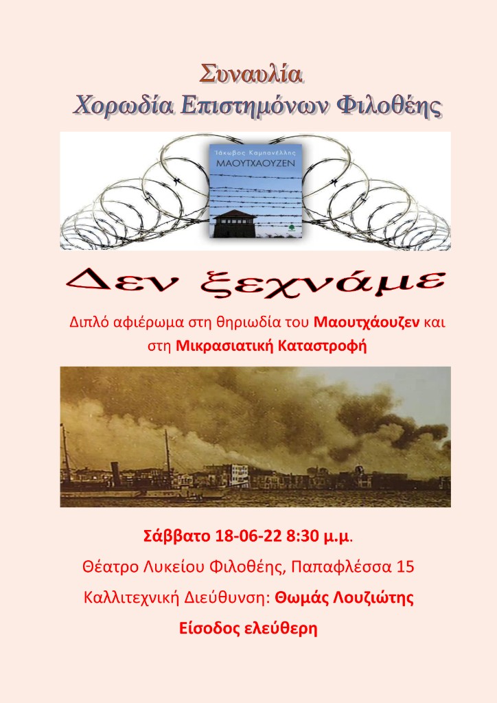 «Δεν ξεχνάμε» Η Χορωδία Επιστημόνων Φιλοθέης διοργανώνει Συναυλία, το Σάββατο 18 Ιουνίου 2022, στις 20:30, στο Λύκειο Φιλοθέης (Παπαφλέσσα 15) με τίτλο “Δεν ξεχνάμε”. Η Συναυλία είναι ένα διπλό αφιέρωμα α) στη θηριωδία του Μαουτχάουζεν και β) στην επέτειο των 100 χρόνων από τη Μικρασιατική Καταστροφή. Το πρόγραμμα περιλαμβάνει τα τέσσερα τραγούδια του Μίκη Θεοδωράκη σε στίχους Ιάκωβου Καμπανέλλη από τον δίσκο “Η μπαλάντα του Μαουχάουζεν” και ένα ακόμα τραγούδι από τον ίδιο δίσκο σε ποίηση Νίκου Γκάτσου, το τραγούδι του Δήμου Μούτση “1922 – Ανατολή” και πέντε τραγούδια του…