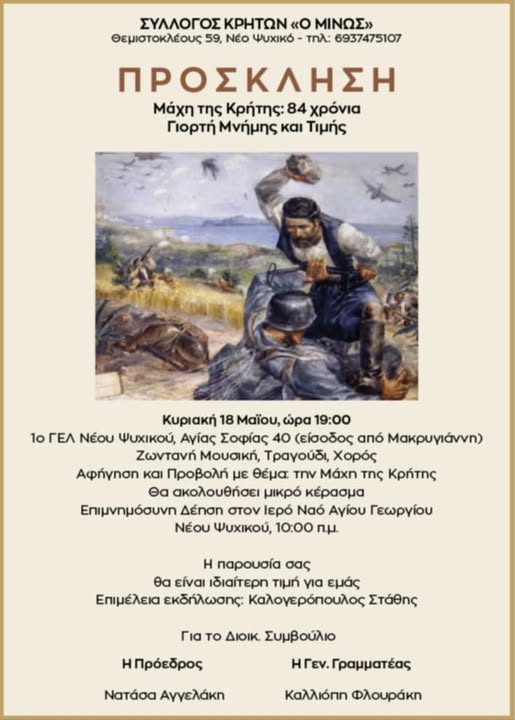 Εκδήλωση στον Ιερό Ναό του Αγίου Γεωργίου στο Νέο Ψυχικό Tην Κυριακή 28 Μαΐου 2023 ο Σύλλογος Κρητών «ΜΙΝΩΣ» προσκαλεί τα μέλη και τους φίλους του στην εορτή της επετείου για την Μάχη Της Κρήτης. Στις 9:30 το πρωί θα τελεστεί Επιμνημόσυνη Δέηση στον Ιερό Ναό Αγίου Γεωργίου στο Νέο Ψυχικό και εν συνεχεία Δοξολογία σε ανάμνηση της γενναίας αντίστασης των Κρητών κατά των εισβολέων κατακτητών. Στις 11:00, στην αίθουσα του Πνευματικού Κέντρου του Ναού θα ακολουθήσει η αναφορά στο ιστορικό της ΜΑΧΗΣ και η εκδήλωση θα πλαισιωθεί με ριζίτικα…