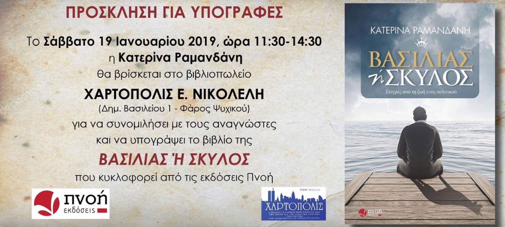 Βιβλιοπαρουσίαση  στο ΧΑΡΤΟΠΟΛΙΣ                   Το βιβλιοπωλείο  ΧΑΡΤΟΠΟΛΙΣ, η Ελένη Νικολέλη (Δημ.Βασιλείου 1 & Λ.Κηφισίας, Νέο Ψυχικό, τηλ:2106777854) και οι Εκδόσεις ΠΝΟΗ, σας προσκαλούν το Σάββατο 19 Ιανουαρίου 2019 και ώρες από 11:30 έως 14:30 στη βιβλιοπαρουσίαση του βιβλίου της Κατερίνας Ραμανδάνη με τίτλο «Βασιλιάς ή Σκύλος», στο χώρο του βιβλιοπωλείου. Το βιβλίο είναι βασισμένο σε αληθινά γεγονότα. Ένα απόσπασμα από το οπισθόφυλλο: «Θα ζήσεις σαν βασιλιάς και θα πεθάνεις σαν σκύλος» του είπε η Ισπανίδα τσιγγάνα. Ένας χρησμός που έκρυβε μέσα του…