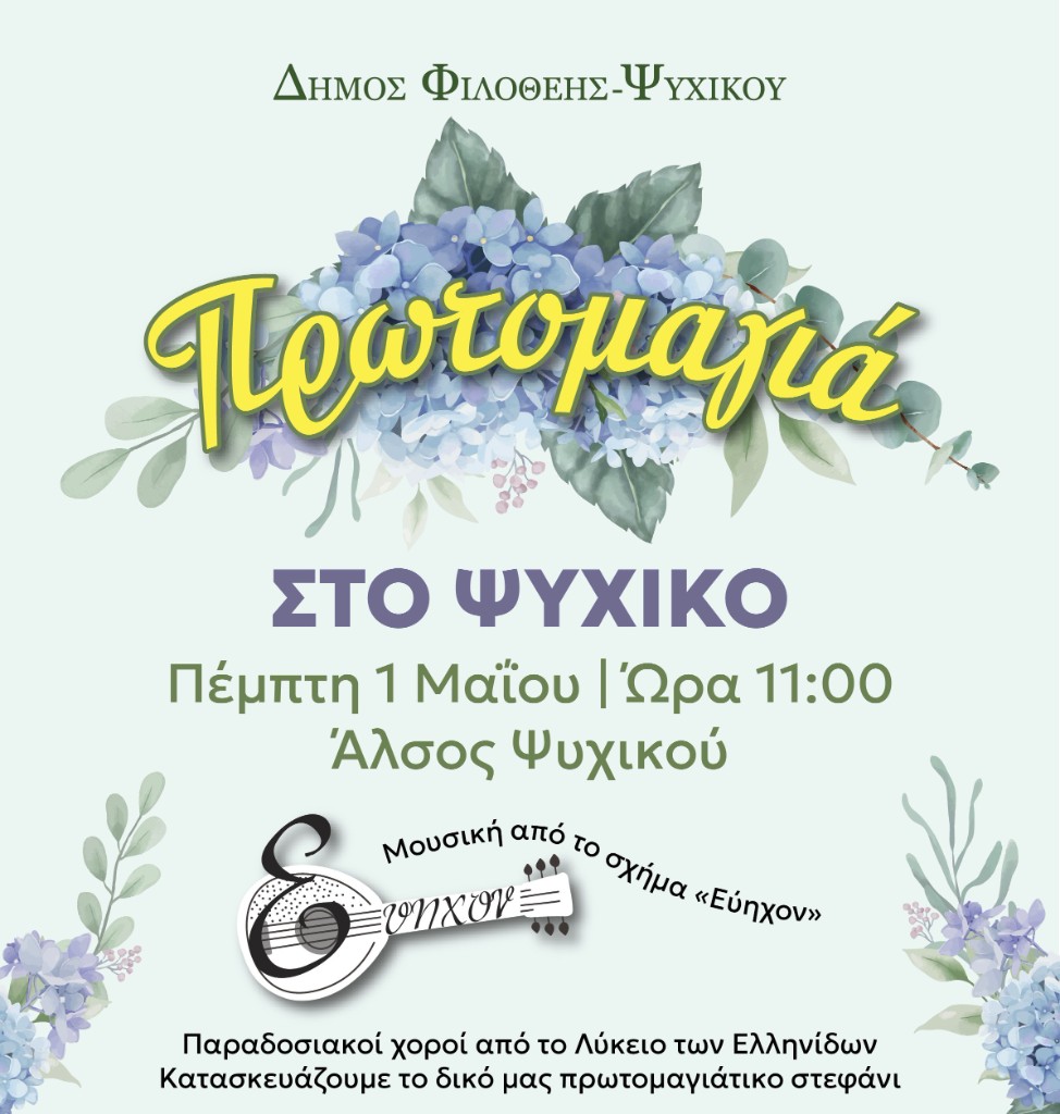 Πέμπτη 1 Μαΐου στις 11:00, στο Άλσος Ψυχικού Ο Δήμος Φιλοθέης – Ψυχικού μάς προσκαλεί την Πέμπτη 1 Μαΐου στις 11:00, στο Άλσος Ψυχικού, για να γιορτάσουμε όλοι μαζί την Πρωτομαγιά με χρώμα, μουσική, χορό και πολλές παιδικές δραστηριότητες. Η γιορτή ανοίγει με μια σύντομη, αλλά ξεχωριστή εμφάνιση από το Λύκειο των Ελληνίδων, που θα παρουσιάσει παραδοσιακούς χορούς, λίγο πριν ξεκινήσει το μουσικό πρόγραμμα από το αγαπημένο σχήμα «Εύηχον», γεμίζοντας την ατμόσφαιρα με μελωδίες και ανοιξιάτικη διάθεση. Στο πνεύμα της ημέρας, θα διανεμηθούν λουλούδια, δίνοντας την ευκαιρία σε όλους –…