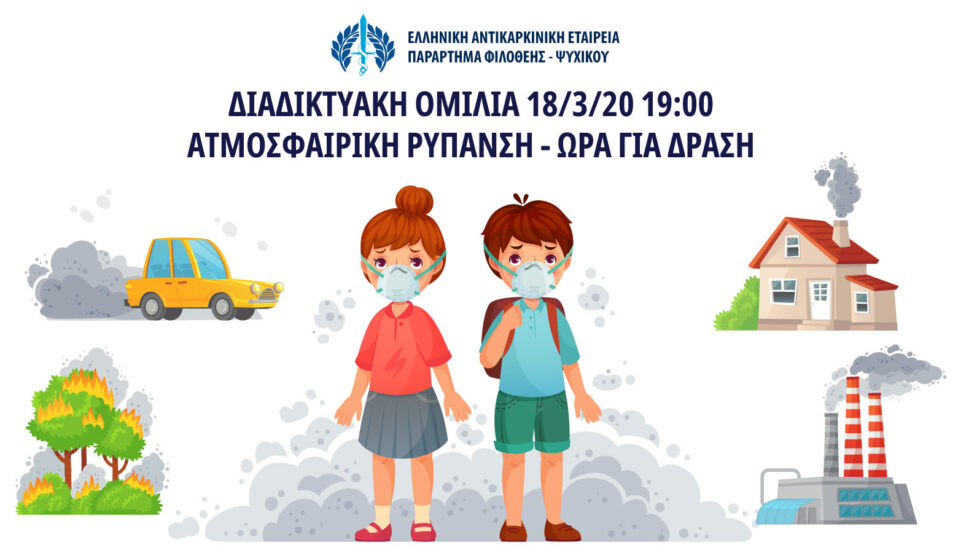 Τζάκια και ατμοσφαιρική ρύπανση σκοτώνουν τους Έλληνες της Όλγας Μενεμενόγλου Γνωρίζετε ότι 11.000 θάνατοι οφείλονται στα μικροσωματίδια που κατά κύριο λόγο τον χειμώνα παράγονται από την καύση των ξύλων; Γνωρίζετε ότι η καύση της βιομάζας αποτελεί τον κύριο παράγοντα αύξησης ατμοσφαιρικής ρύπανσης του χειμώνα, ιδίως στις μεγάλες πόλεις; Αυτά και για άλλα πολλά τέτοια στοιχεία θα μιλήσει ο Πρόεδρος της Ελληνικής Αντικαρκινικής Εταιρείας κύριος Ευάγγελος Φιλόπουλος στην διαδικτυακή συνάντηση που διοργανώνει το παράρτημα Φιλοθέης – Ψυχικού στις 18/3/21 ημέρα Πέμπτη και ώρα 19:00. Το θέμα της συζήτησης είναι «ΑΤΜΟΣΦΑΙΡΙΚΗ ΡΥΠΑΝΣΗ-ΩΡΑ…